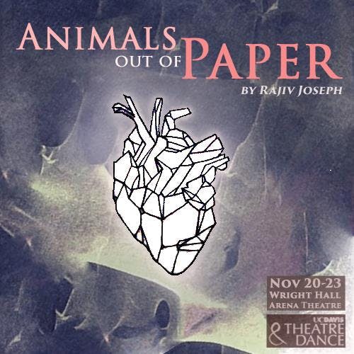 Animals Out of Paper is an upcoming play here at UC Davis directed by fourth year Dramatic Arts major and Sexualities minor, Micaela Cirimeli. Animals Out of Paper begins as a quirky comedy about origami experts and quickly turns into a melancholy reminder that even the closest people can make the worst messes. This auditory and visual journey from extreme to extreme is exciting, unique and dynamic, pulling realistic and honest insights out of highly unusual situations in accordance with some a unique soundtrack of music specially curated for the show. When a world renowned origami artist opens her studio to a teen prodigy and his smitten school teacher, she finds that life and love is near impossible to arrange neatly in a perfect fold in this dramatic comedy piece.