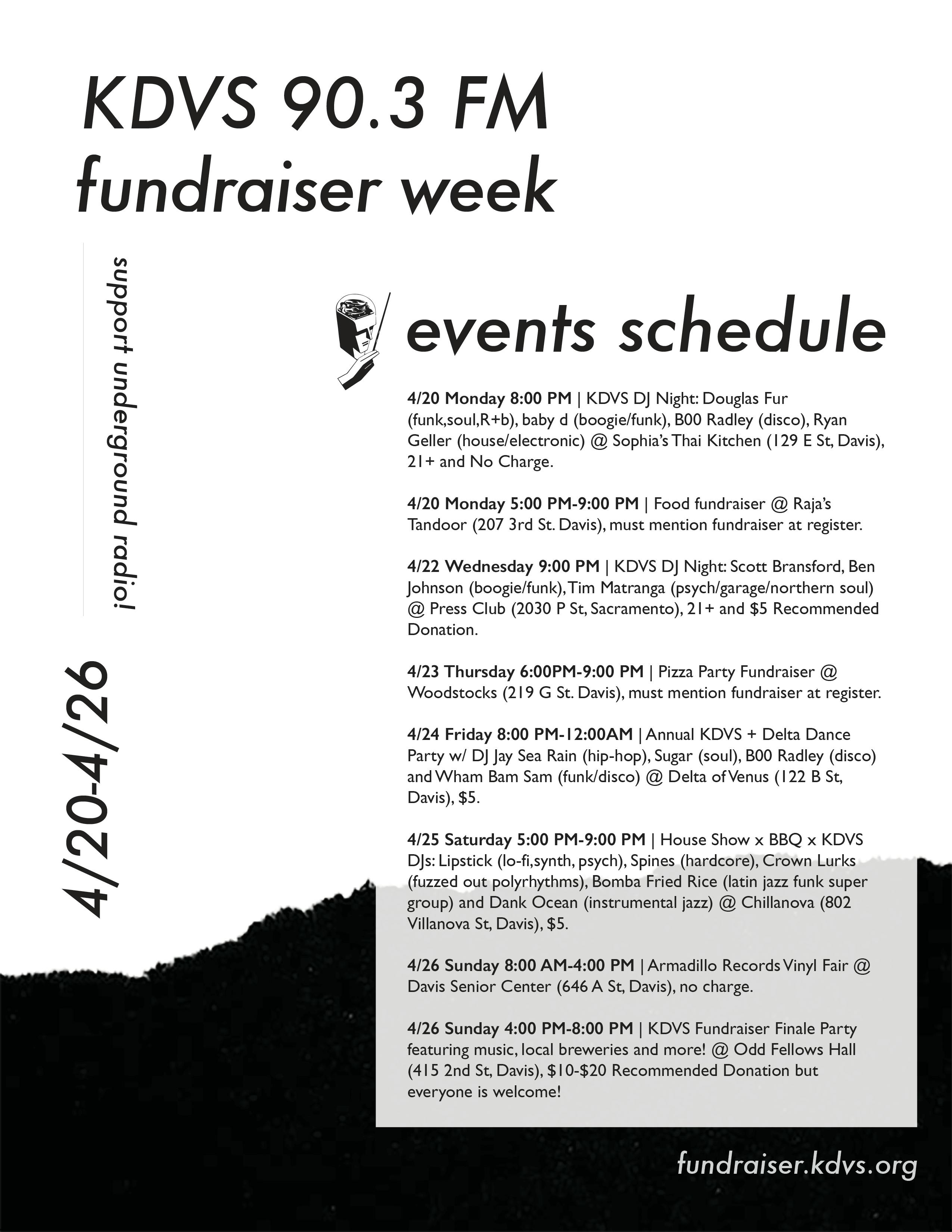 We will be hosting several events throughout the week of April 20th-26th to celebrate fundraiser week. Come hang out with us! If you’re interested in donating make sure to stop by at fundrasier.kdvs.org. Our goal this year is $60,000 and we greatly appreciate any support. Help keep us on air, we can’t do this alone. Also as a thank you from us to you, we’ve put together a collection of premiums – from shirts, music, and the ability to host your own show to name a few – that can be viewed on the website. Come out and support us in person at the events listed below. We’ll see you there!