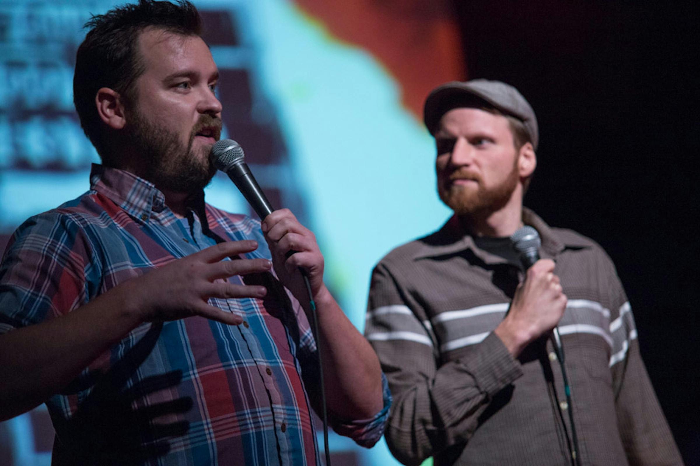 Curators Joe Pickett (left) and Nick Prueher introduce a VHS clip at a Found Footage Festival show in Milwaukee. Photo by Erik Ljung.