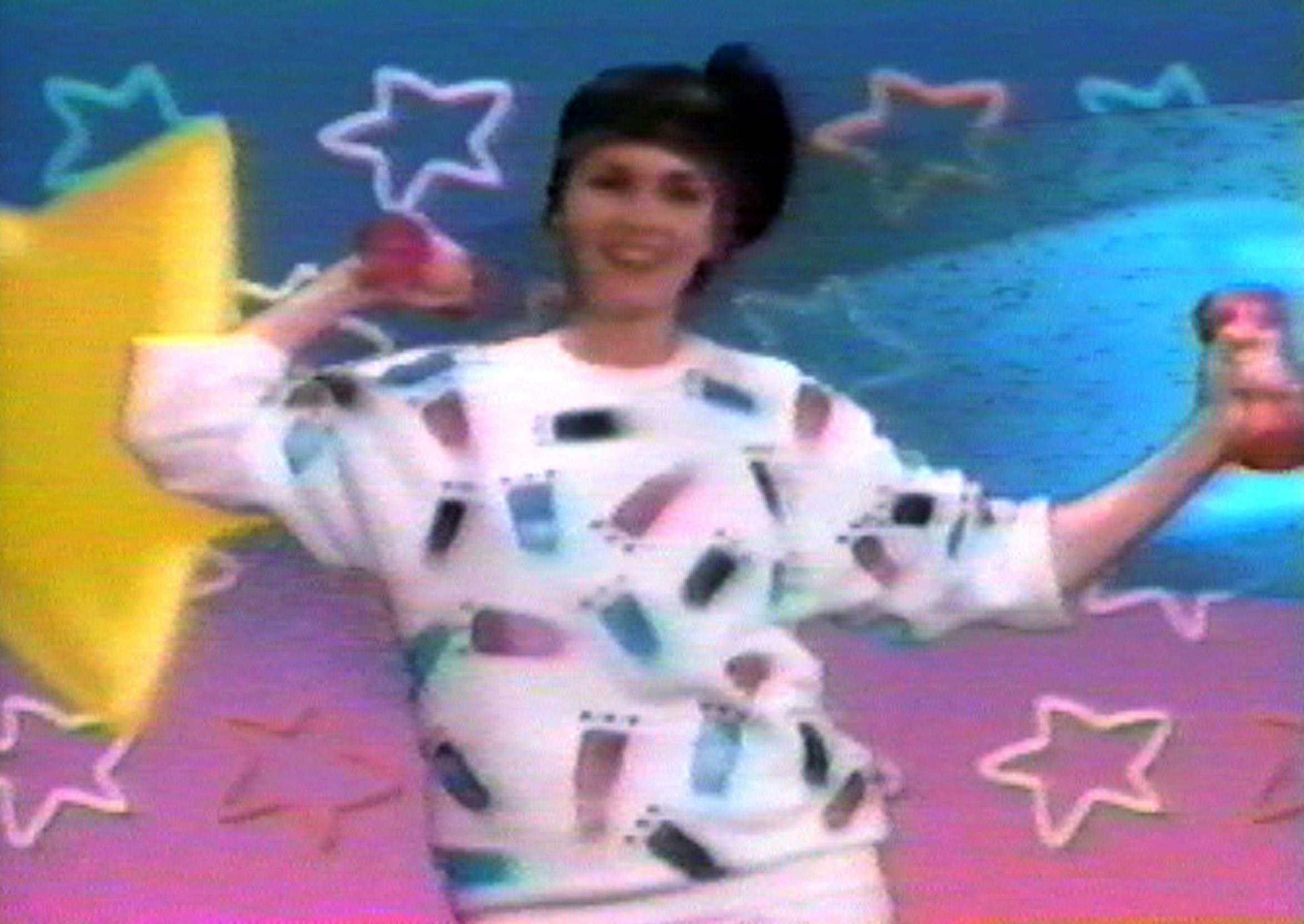 A woman in a painted sweatshirt works out in the ambitious opening music video to “Totally Tulip,” a 1988 fabric painting instructional tape. Courtesy of the Found Footage Festival.