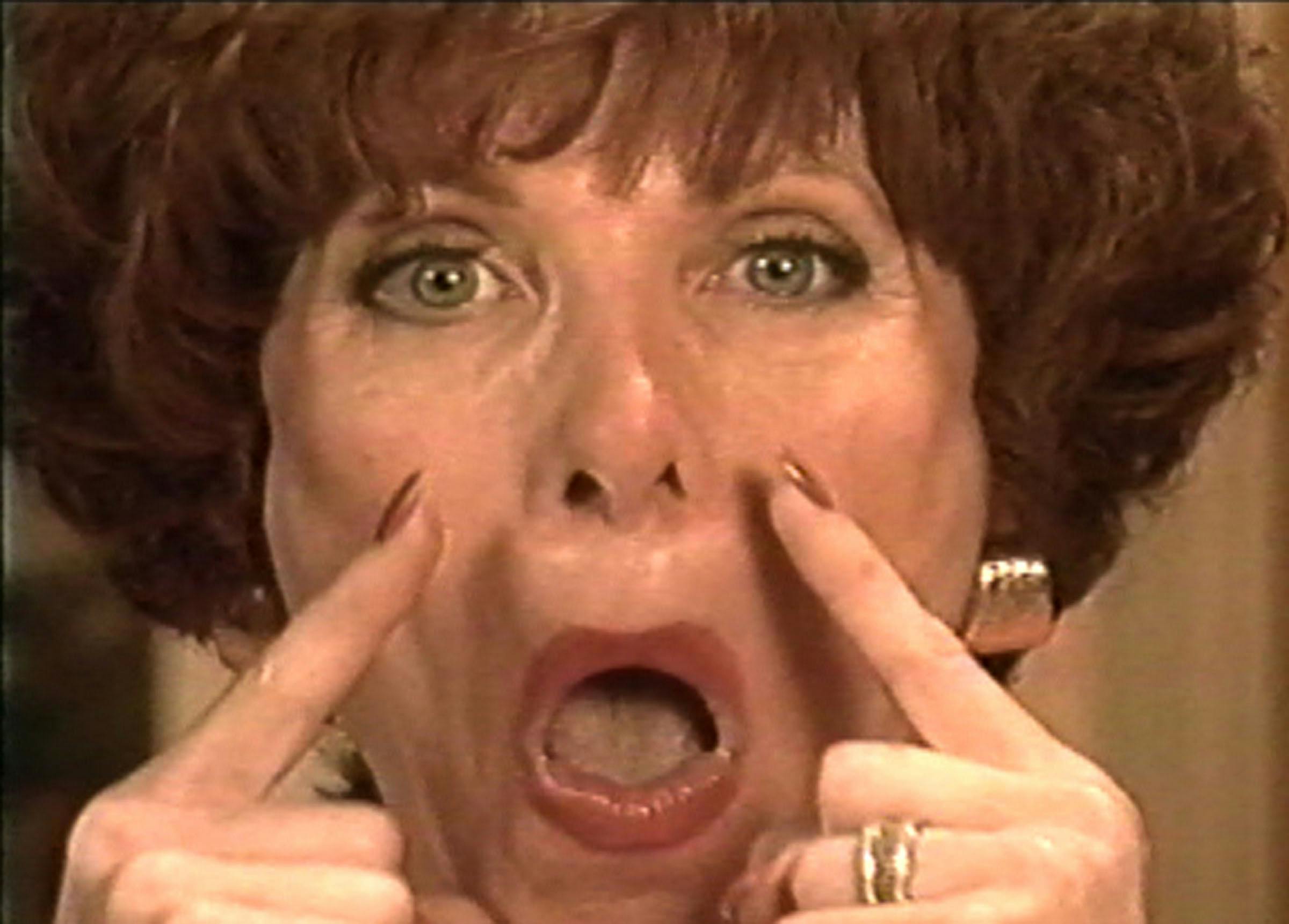 Carole Maggio, the host of the 1996 facial workout video, “Facercize,” tightens and tones her cheek muscles. Courtesy of the Found Footage Festival.