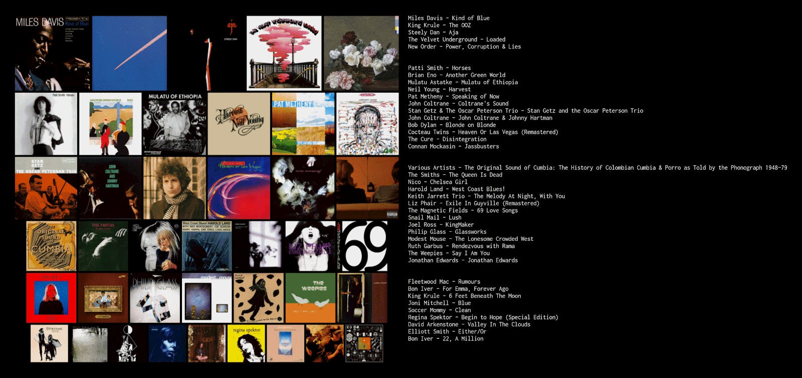 I think that thinking about art this way guided many of my other choices for top 40 albums. Because, top 40 what? How are these being ranked? I wasn’t really trying to make a list of what I think are objectively the best 40 albums of all time (which would be tricky anyway, because acclaim and artistic merit are two different things, not to mention that I don’t know enough about music to do that anyway). And there are plenty of albums—actually, probably the majority of things I listen to regularly—that I don’t think are that “good,” if “good” means that they contribute to some cultural understanding of what can be achieved through sound, so I guess I didn’t make a list of my 40 most-listened to albums, or even plainly just my favorite albums. I guess I made a top 40 list of albums I really love and think are important because they each taught me something a little different about what music can do, the power of creative imagination and technical skill, and how some art can change everything, even in times when stasis seems oppressive and inescapable. For some of these albums, maybe I only think they’re so important because someone told me they were.